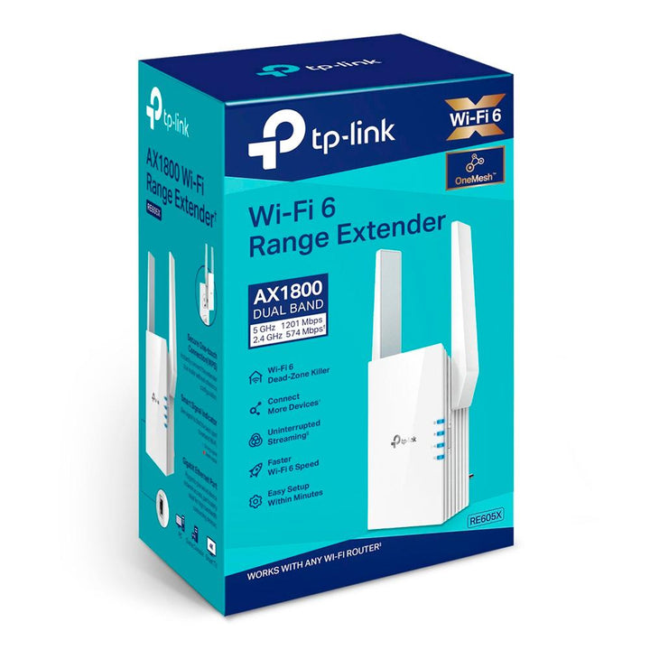 - CARACTERISTICAS: Extensor AX1800 de doble banda Wi-Fi 6, 574 Mbps en 2.4 GHz + 1201 Mbps en 5 GHz, 2 antenas externas, 1 puerto Gigabit, CPU Broadcom Quad-Core de 1.5GHz, 1024 QAM, Enchufe directo a pared, Tether App, WPS, indicador de señal inteligente, Horarios de encendido / Apagado, Luz LED, modo RE/AP, OneMesh, Beamforming, MU-MIMO, OFDMA