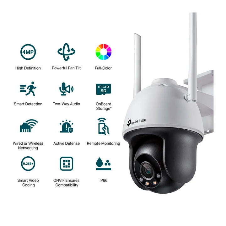 Cámara Wi-Fi IP de 4MP, Full Color, con Función de Paneo/inclinación. Especificaciones: 2.4Ghz a 150Mbps, 2*2 MIMO. Codecs H.265+/H.265/H.264+/H.264, CMOS de Escaneo Progresivo a 1/3, Color/0.04 Lux@F1.6, 0 Lux con IR/Luz Blanca, 25fps/30fps (2560x1440,2304x1296, 2048x1280, 1920x1080), 12V DC, Lente Fijo 4 mm, Micrófono, Parlante y ranura de Micro SD. INCLUYE: Visión Nocturna (hasta de 30M) a Full Color/IR, Defensa Activa, Audio de Dos vías, Almacenamiento incluido, Detección Inteligente (Detección de Movimiento con Clasificación Humana, Manipulación de la Cámara, Cruce de Línea, Intrusión de Área), SmartVid (IR Inteligente, WDR, 3D DNR, BLC), ONVIF. Monitoreo Remoto, App VIGI