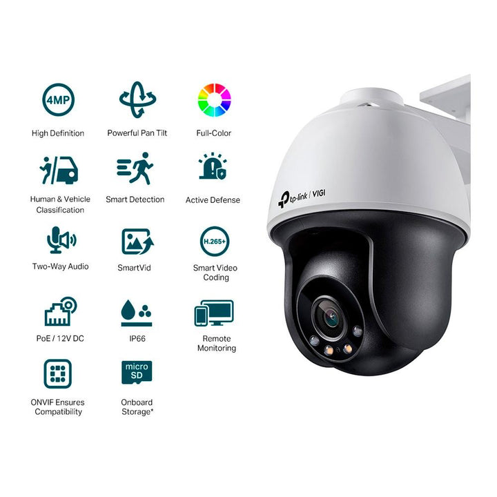 Cámara IP de 4MP, Full Color, con Función de Paneo/inclinación. Especificaciones: Codecs H.265+/H.265/H.264+/H.264, CMOS de Escaneo Progresivo a 1/3, Color/0.04 Lux@F1.6, 0 Lux con IR/Luz Blanca, 25fps/30fps ( 2560x1440,2304x1296, 2048x1280, 1920x1080), 12V DC, Lente Fijo 4 mm, Micrófono, Parlante y ranura de Micro SD. FUNCIONES: Visión Nocturna (hasta de 30M) a Full Color/IR, Defensa Activa, Audio de Dos vías, Almacenamiento incluido, Detección Inteligente (Detección de Movimiento con Clasificación Humana, Manipulación de la Cámara, Cruce de Línea, Intrusión de Área), SmartVid (IR Inteligente, WDR, 3D DNR, BLC), ONVIF. Monitoreo Remoto, App VIGI